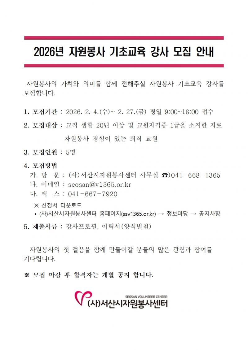 | 제목 | 2026년 자원봉사 기초 교육 강사 모집 안내 | ||