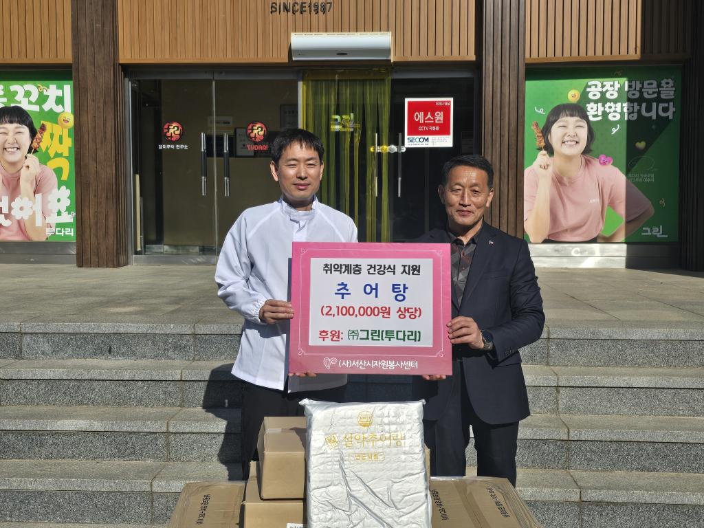 "(주)그린, 따뜻한 밥상으로 이웃사랑 실천! 서산시자원봉사센터에 추어탕 210만 원 상당 후원" (주)그린은 지난 2025년 11월 11일(화), (사)서산시자원봉사센터(이사장 한도현)에 210만 원 상당의 추어탕을 전달했습니다. 이번 후원은 면역력 강화와 영양 보충이 절실한 어르신들에게 든든한 보양식을 제공하기 위해 이루어졌습니다. 기탁된 추어탕은 센터의 대표적인 봉사 프로그램인 '따뜻한 밥차' 사업에 사용될 계획입니다. '따뜻한 밥차'를 통해 관내 독거노인 및 저소득층 어르신들에게 제공되는 무료 급식에 추어탕이 메뉴로 올라, 어르신들의 건강한 겨울나기를 도울 예정입니다. (주)그린 박재필 상무는 "어르신들이 건강하게 겨울을 보내시는 데 조금이나마 도움이 되기를 바라는 마음으로 추어탕을 준비했다"며, "앞으로도 지역사회에 나눔의 온기를 전하는 일에 지속적으로 동참하겠다"고 밝혔습니다. 이경구 센터장은 "경제적으로 어려운 시기임에도 불구하고 이웃 사랑을 실천해 주신 (주)그린 김형택 대표님께 깊이 감사드린다"며, "정성껏 마련해 주신 추어탕으로 어르신들의 몸과 마음이 따뜻해지는 밥상을 차리겠다"고 전했습니다. (주)그린의 이번 후원은 지역 기업이 자원봉사센터와 협력하여 지역 복지 증진에 기여하는 아름다운 나눔의 사례로 평가받고 있습니다. |