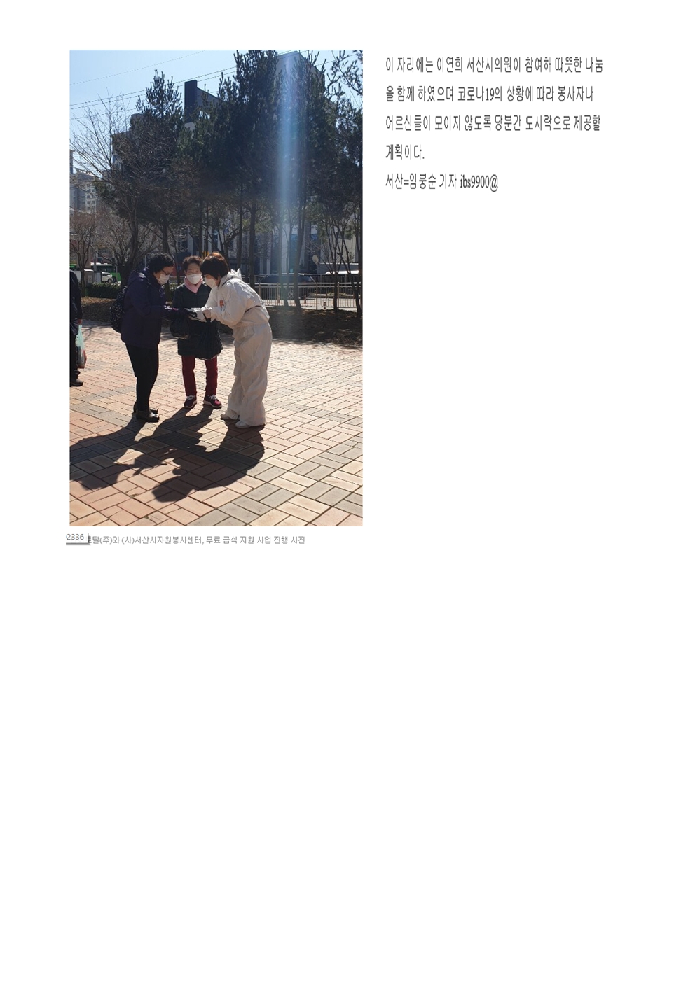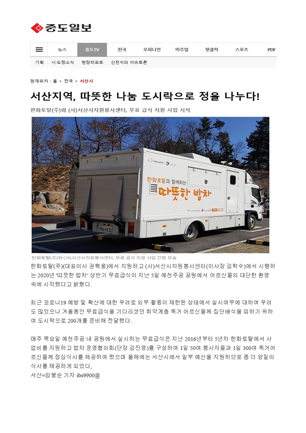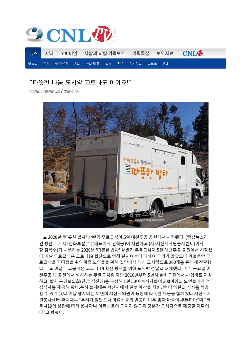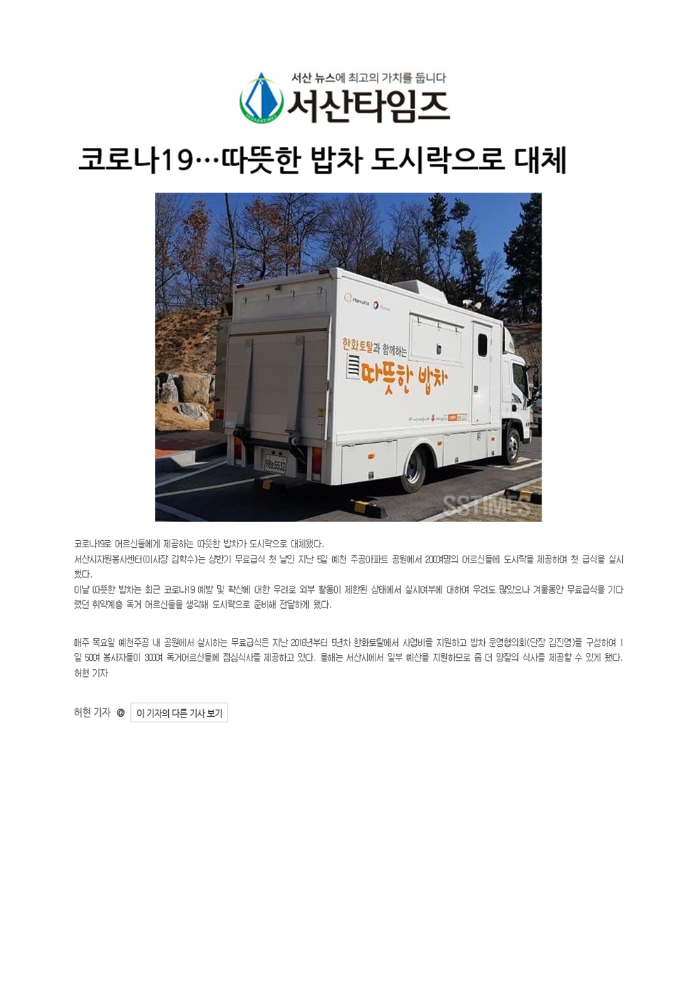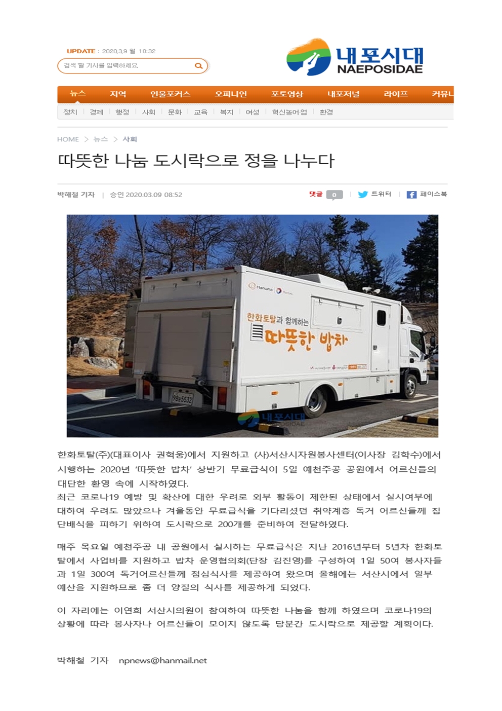 | 35 | 따뜻한 밥차 도시락으로 정을 나누다 | 20-03-09 | |||