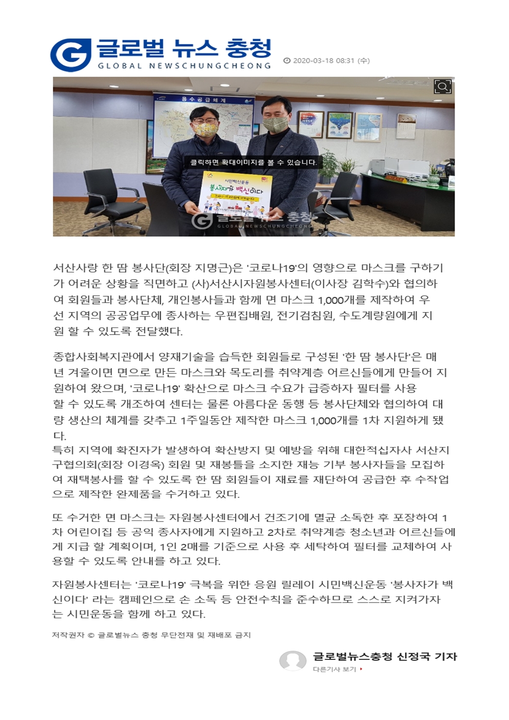 | 36 | 수제마스크로 나눔을 실천하는 서산 사랑 한 땀 봉사단 | 20-03-18 | |||