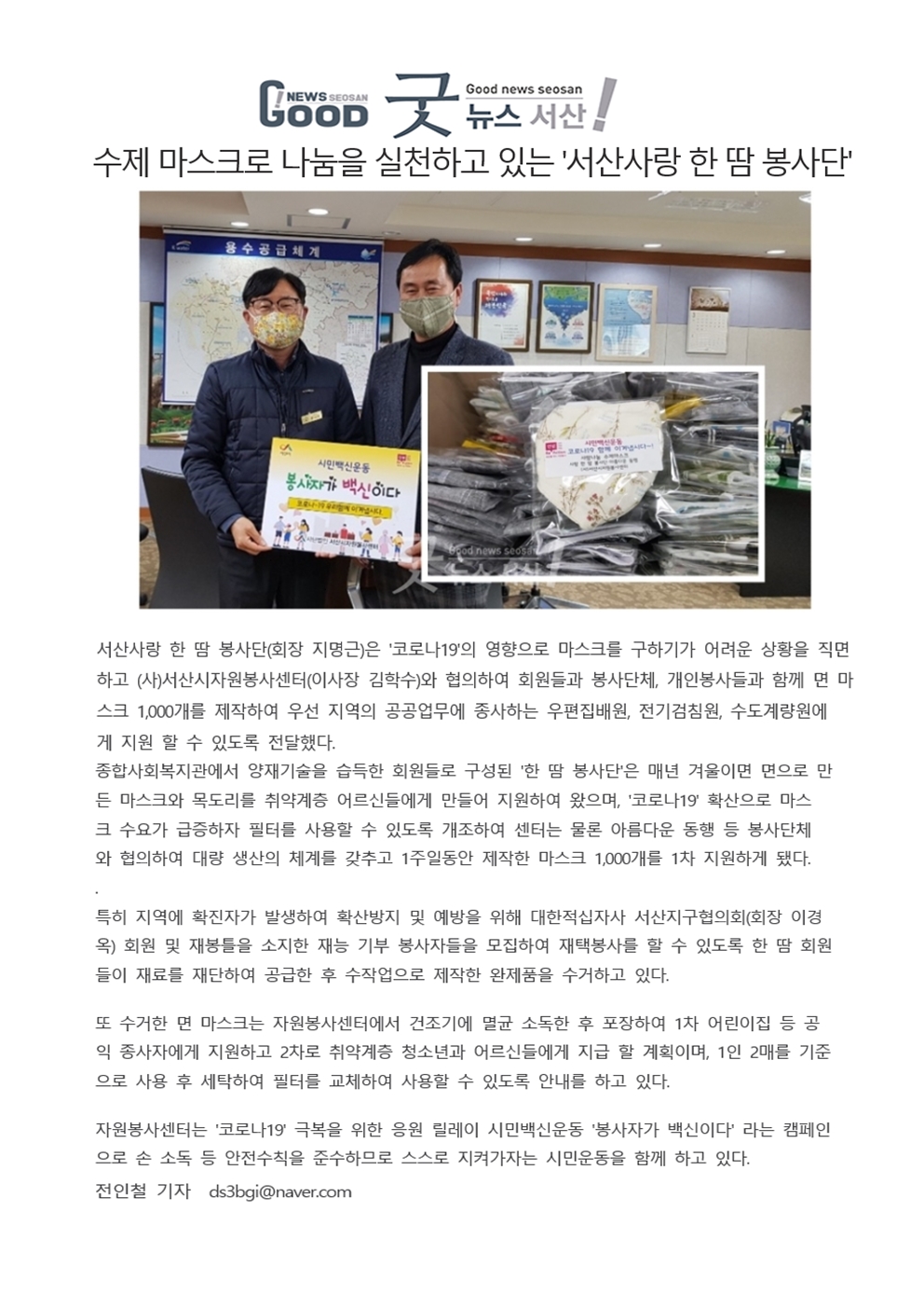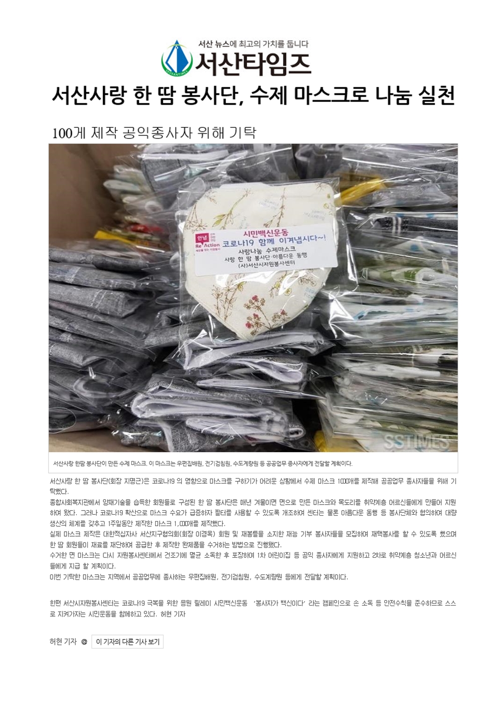 | 제목 | 수제마스크로 나눔을 실천하는 서산 사랑 한 땀 봉사단 | ||