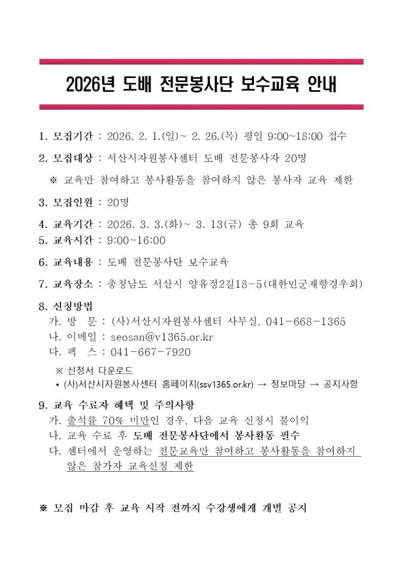 | 137 | 2026년 자원봉사 기초 교육 강사 모집 안내 | 26-02-04 | |||
