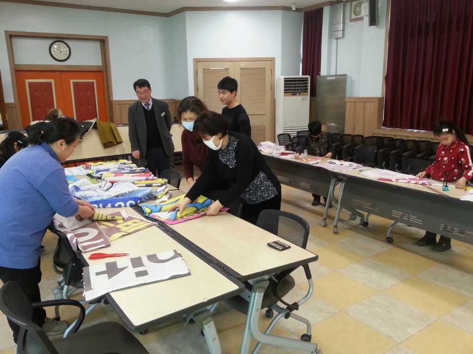 2월22일 성연면 주민자치센터에서 팔토시를 만들기 전 세탁한 폐현수막을 재단하는 활동을 했습니다